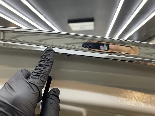 ウィンドウには、固着した水アカや雨ジミを除去するガラス鱗(ウロコ)除去を行い、その後ウィンドウ撥水加工を施工。視界がクリアになり、雨天時や夜間走行時の安全性も向上しました。5年落ちの アルファードの中古車でも、